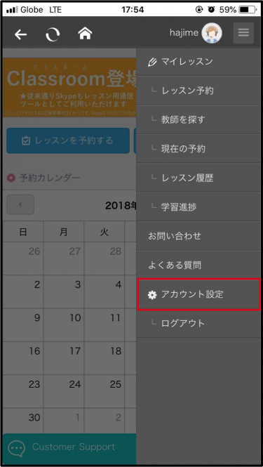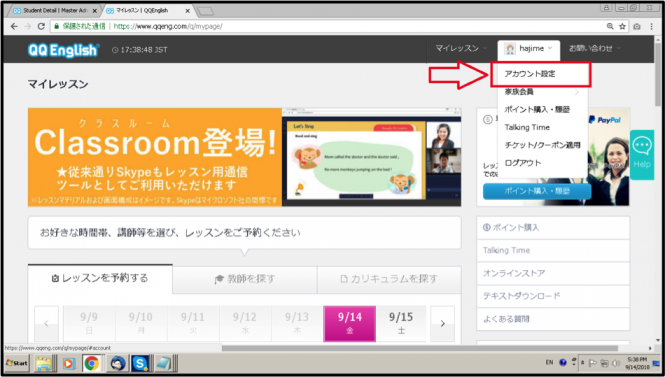 1. マイレッスンにログイン後、画面右上のドロップメニューから「アカウント設定」を開きます。