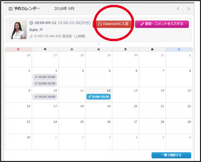 3. 予約カレンダーから当日のレッスン予定をクリックすると、「Classroomに入室」ボタンが表示されます。「Classroomに入室」ボタンをクリックすると、「Classroom」に入室できます。