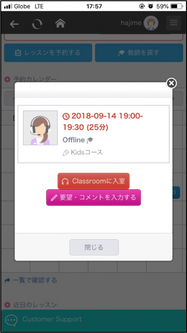 4. 予約カレンダーから当日のレッスン予定をクリックすると、「Classroomに入室」ボタンが表示されます。「Classroomに入室」ボタンをクリックすると、「Classroom」に入室できます。
