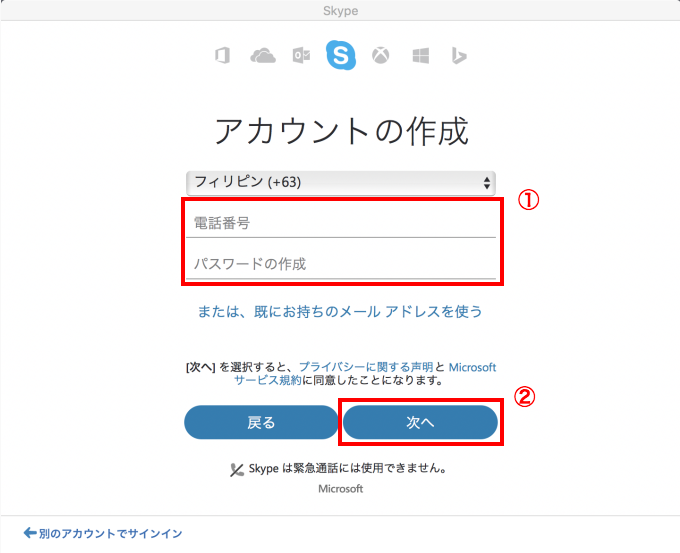 Skype のサインイン画面で [アカウントの作成] を選択します。