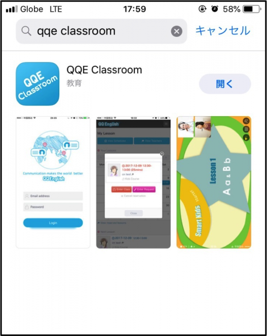 事前にGoogle Play(Androidの場合)、またはApp Store(iOSの場合)より「QQ English」あるいは「QQE Classroom」と検索し、専用のアプリケーションをダウンロードしてください。