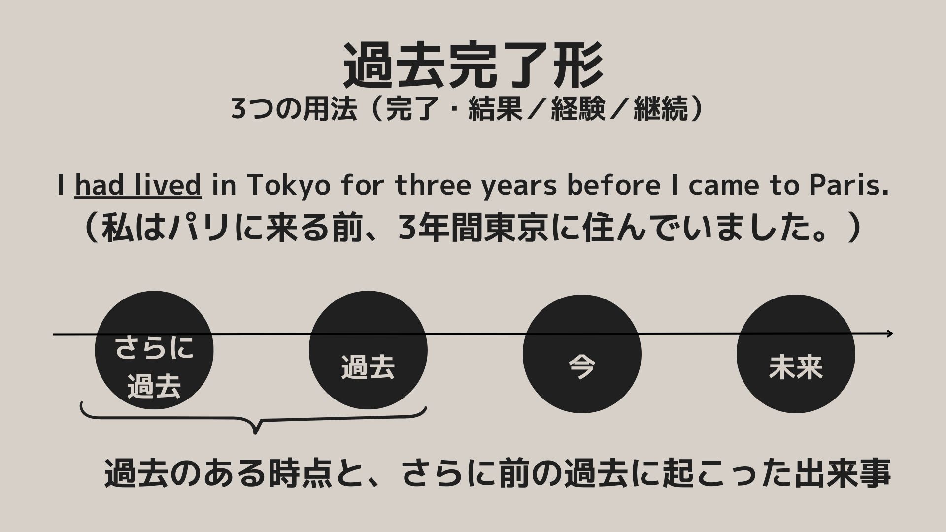そして過去完了形は「ある一点の過去よりも前(過去よりもさらに過去)から、ある一点の過去までの出来事」を表します。