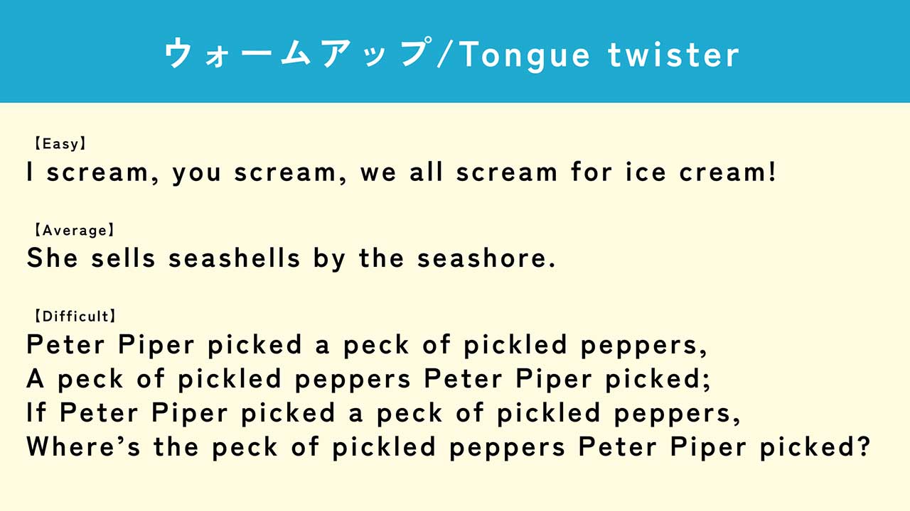 簡単な「I scream, you scream, we all scream for ice cream!」から始まり、Difficult「Peter Piper picked a peck of pickled peppers…」まで3つのレベルのTongue Twister(英語早口言葉)に挑戦。