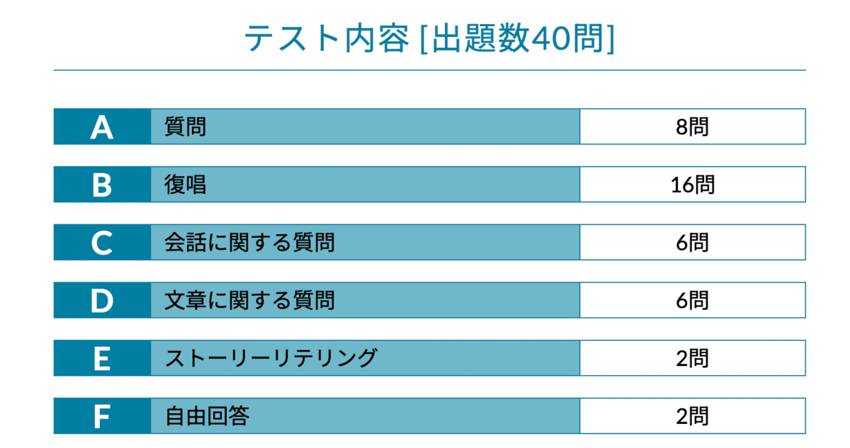 VERSANT(Versant English Speaking and Listening Test)のテスト時間は約20分、出題数は40問です。