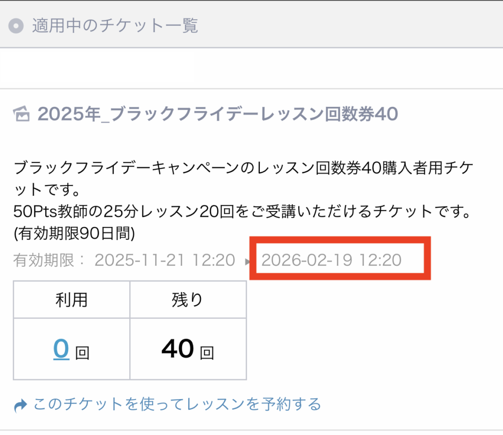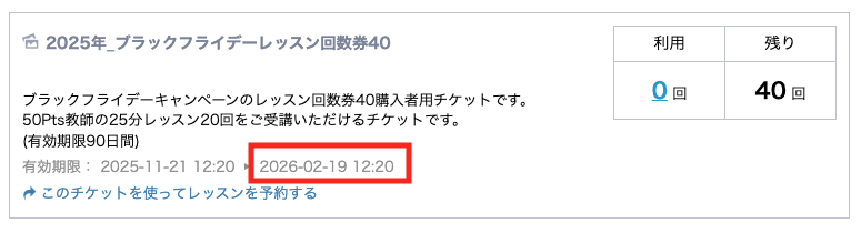 英会話レッスン回数券(チケット)の付与から、90日(英会話レッスン回数券40)または60日(英会話レッスン回数券20)以内でのレッスン受講が可能です。