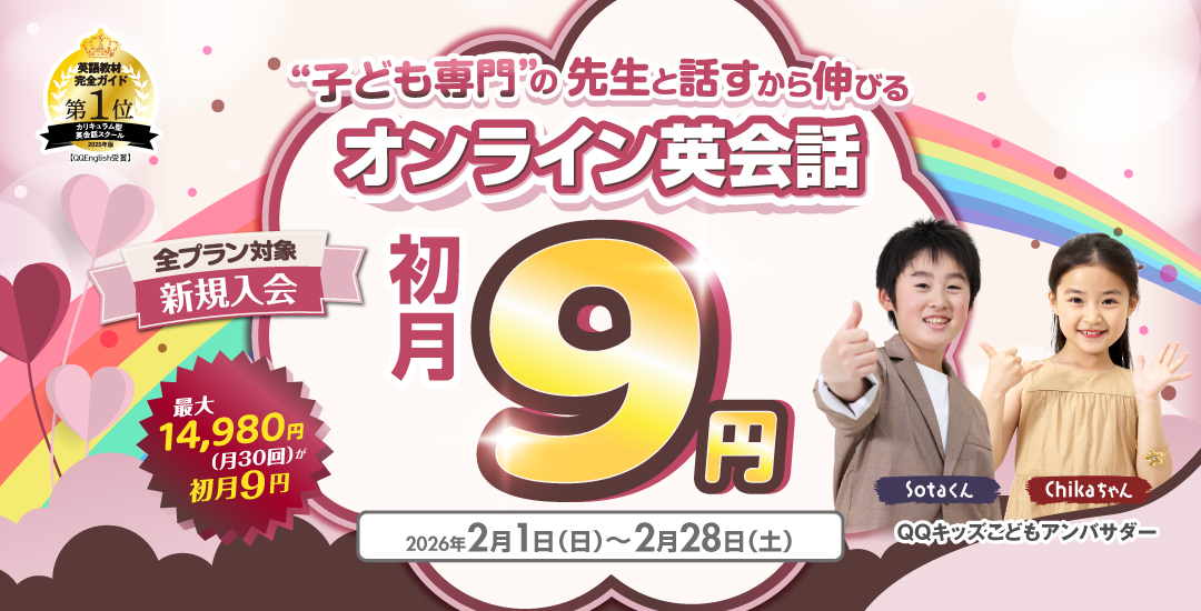 - 【子ども専用オンライン英会話 QQキッズ】2026年2月新規入会者全プラン初月9円キャンペーン