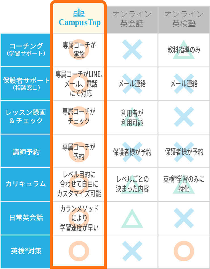 CampusTopさんでは日本人コーチが伴走しお子様に最適な学習プランを提供でき、また子ども英語指導のプロの先生と毎日レッスンを受講することができる点で優れていて、安心してお子様を預けられる環境が整っていることからもお勧めします。