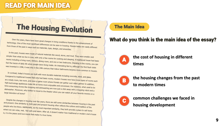 教師の指導のもと、各段落を精読していきます。語句の理解を深めながら、詳細な情報にも注意を払いながら、文章を読み込んでいきます。最終的には短い文章で全体の要約を行うことで、要点をまとめる力を育成します。