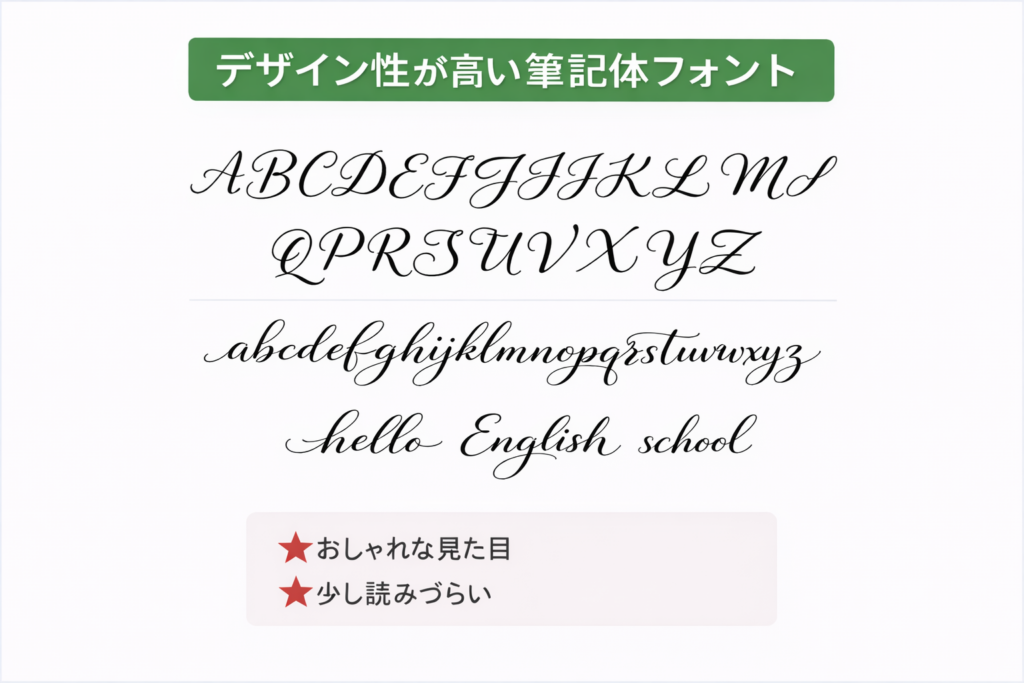 一方で、初心者でも比較的読みやすい筆記体フォントには、共通した特徴があります。