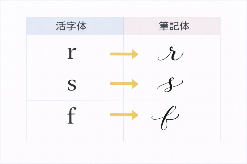 筆記体では、活字体と形が大きく変わるアルファベットがあります。